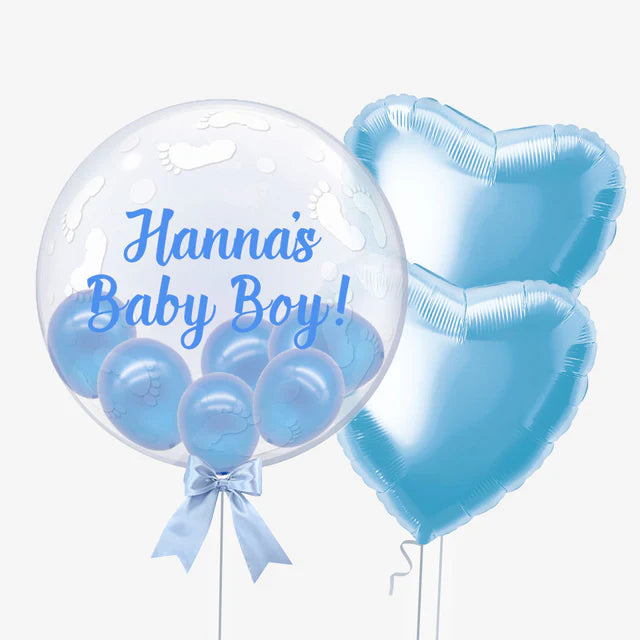 Girl or a boy… Send this gorgeous 24" personalised bubble balloon complete with cute baby feet detailing and mini balloons! This bubble balloon makes a perfectly unique baby shower gift, that will stand out against them all.